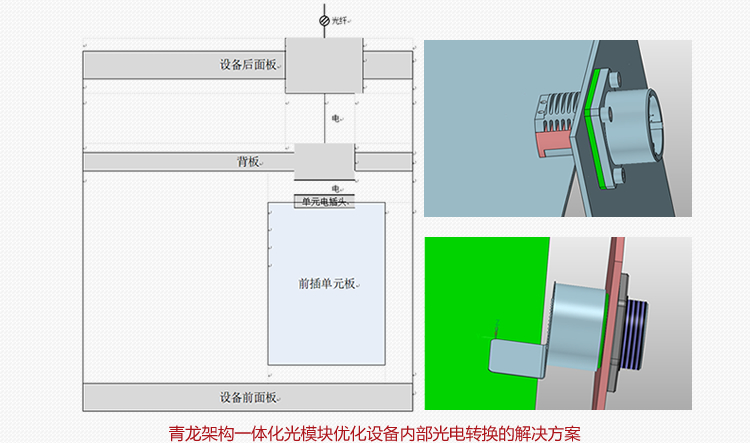 青龙架构的一体化结构取消了光纤跳线。在这种结构中,设备内部不再有光纤互连,降低了设备内部设计复杂度,优化了内部工艺, 提升了传输可靠性,提供了设备光纤传输距离光信号直接从光模块通过内部的光适配器件等传输至航插接口,减少了中间连接环节,避免了因光纤跳线插拔造成的损耗和不稳定.相对原来传统方案节省了30%~50%的内部空间。同时,该设计使内部光通路相对固定,降低了因外界振动、冲击等因素导致光信号传输中断或受干扰的风险,能够更好地适应复杂恶劣的使用环境.