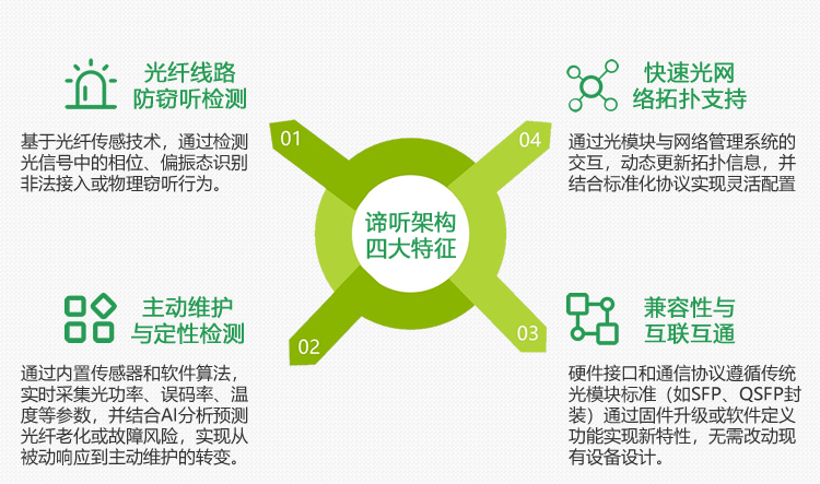 谛听架构光模块通过融合智能化监控、安全防护和兼容性设计,实现了从传统被动维护到主动检测的跨越。其核心价值在于提升网络安全性、降低运维成本,并适应高速率、高可靠性的未来通信需求。随着AI与硅光技术的进一步融合,此类光模块有望在5G、数据中心及关键基础设施领域成为主流解决方案。